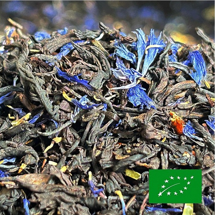Ingredients: Lapsang Souchong black tea*, natural bergamot flavor, cornflower petals*, bergamot peel*